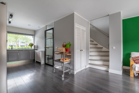 Begane grond: hal met toilet, moderne open keuken en aangrenzend de ruime eetkamer. Toegang tot de ruime achtertuin met schuurtje